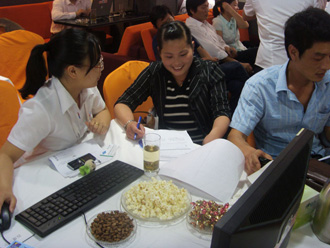 來賓在客服的指導(dǎo)下填寫調(diào)查問卷